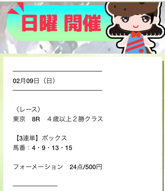 9日(日)の無料予想では競馬初心者だった私がサイトのサポート(馬券の買い方)を受けて